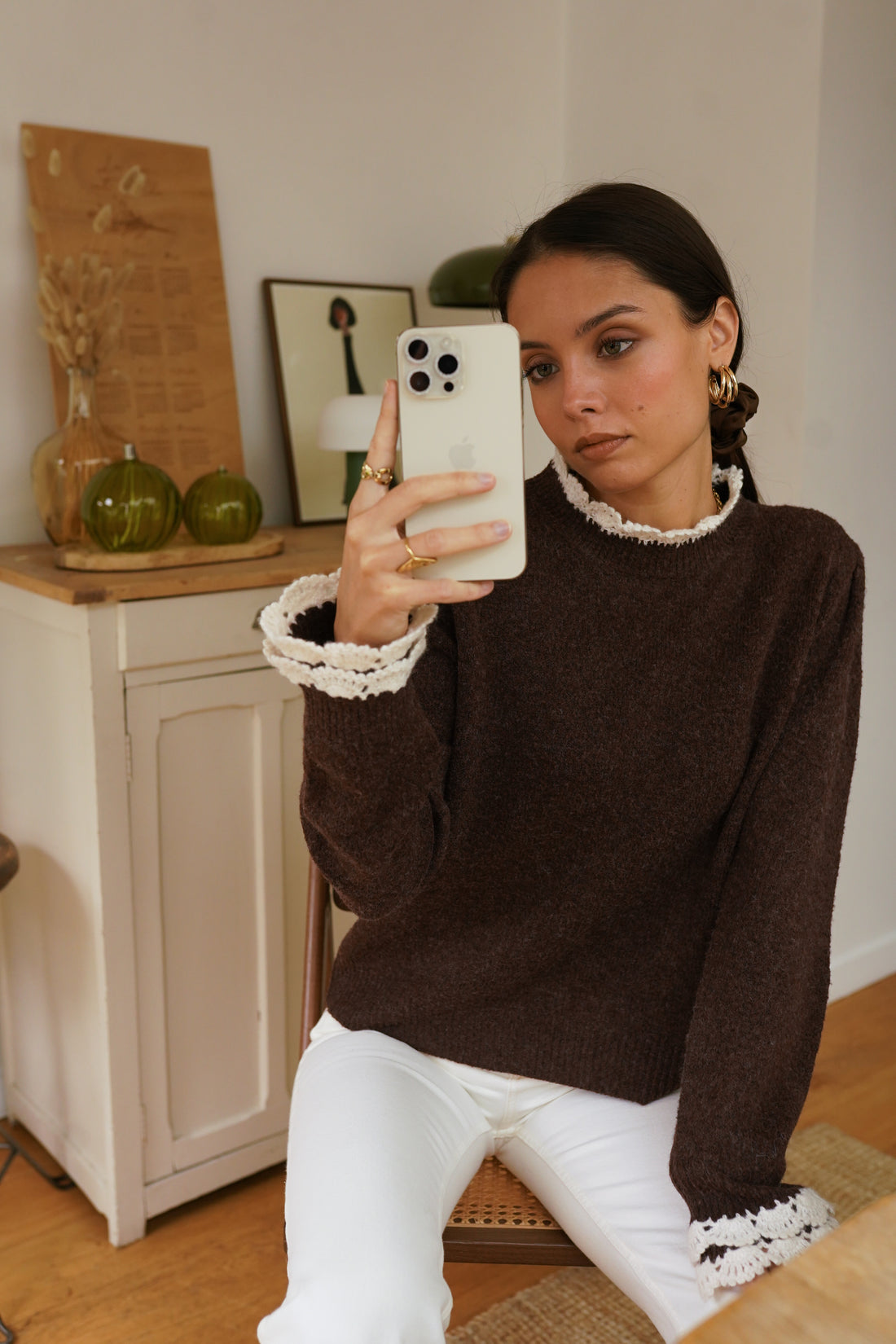 - Le pull Côme marie une maille chocolat chaleureuse à des finitions en crochet écru délicates sur le col et les poignets. Cette pièce crée un contraste harmonieux entre sa texture douillette et ses détails travaillés, offrant un charme rétro subtil tout en restant facile à porter au quotidien.