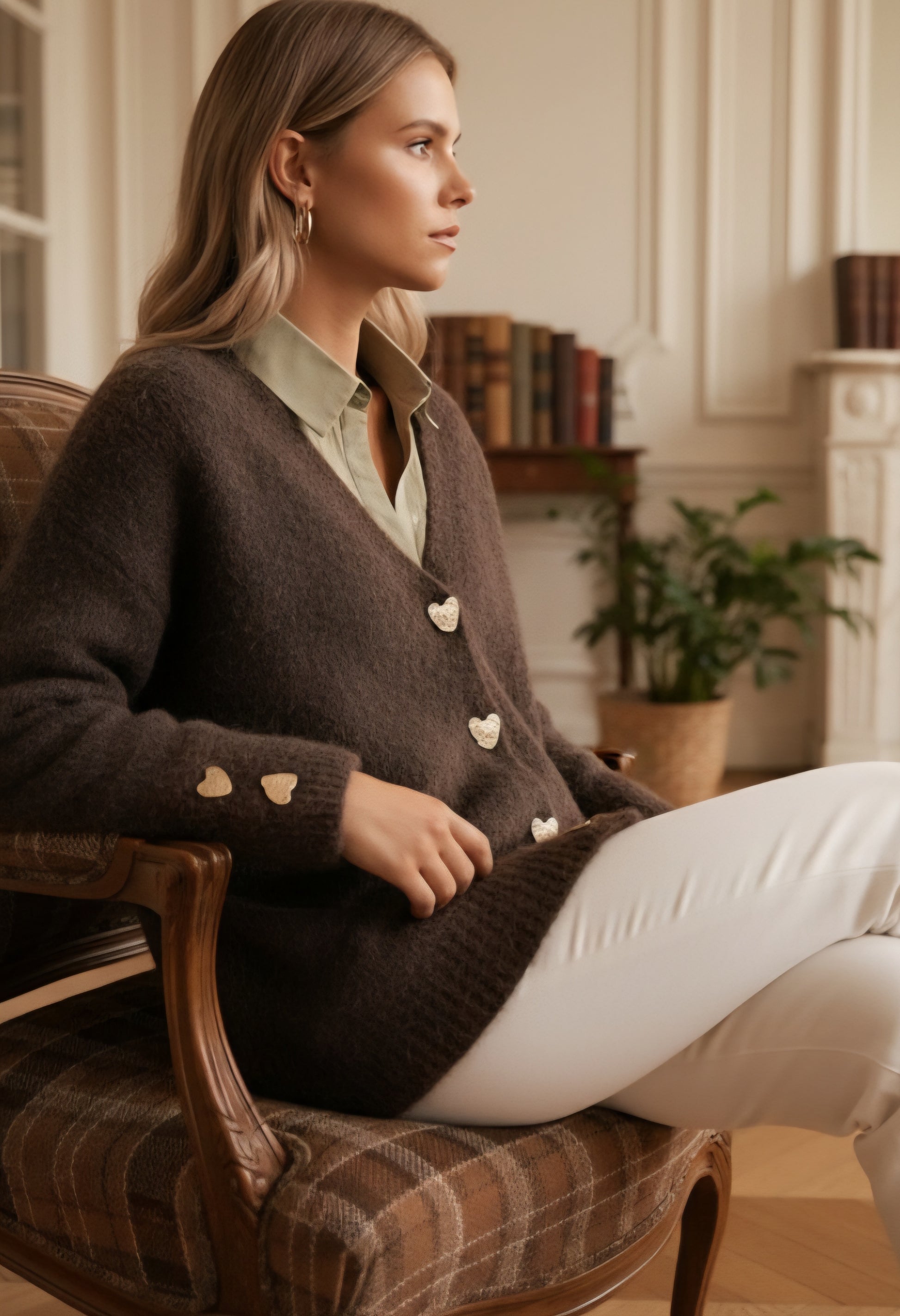 Ce gilet cardigan chocolat en maille texturée est l'allié parfait pour l'élégance et le confort. Il présente des boutons en forme de cœurs dorés qui ajoutent une touche vintage et romantique.